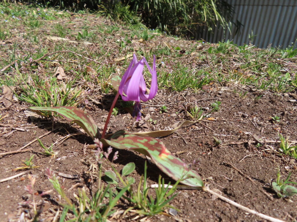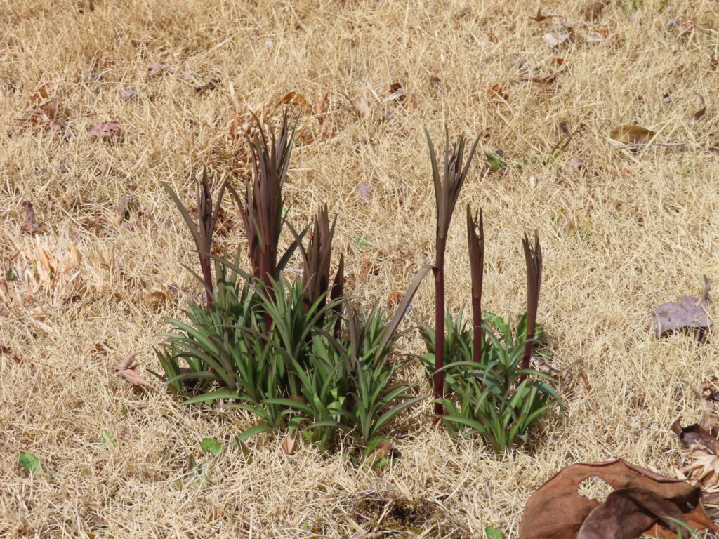 枯れた芝生の中から「アミガザユリ」が芽を出しました