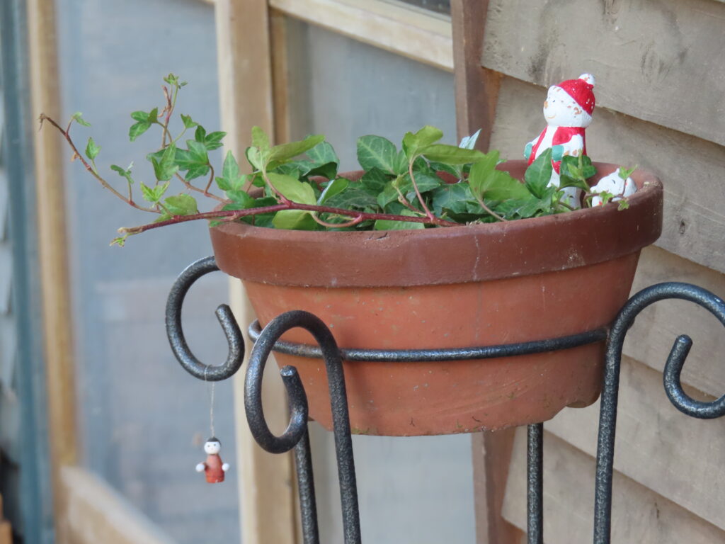 アイビーを鉢に植えて、サンタを飾りました