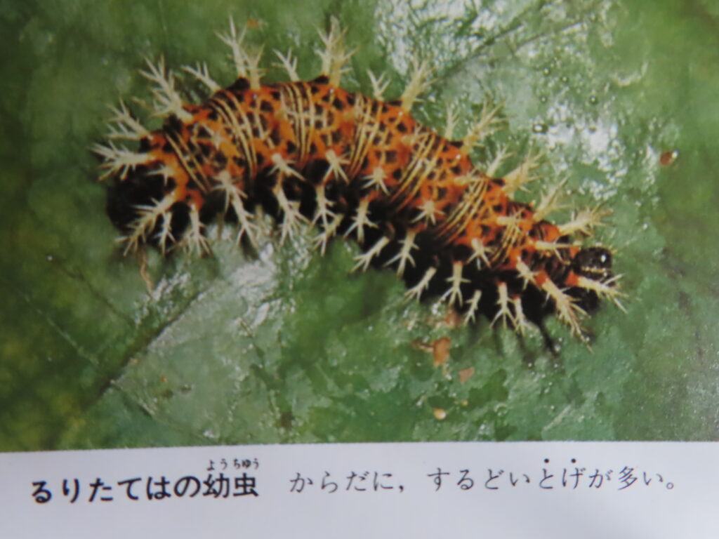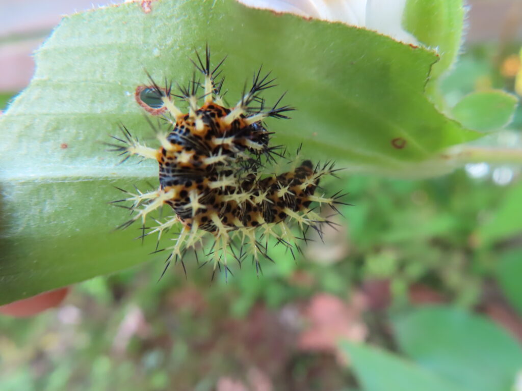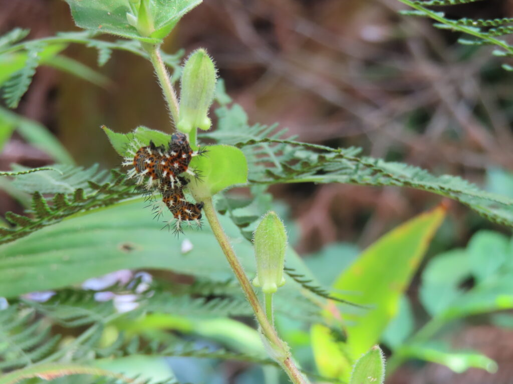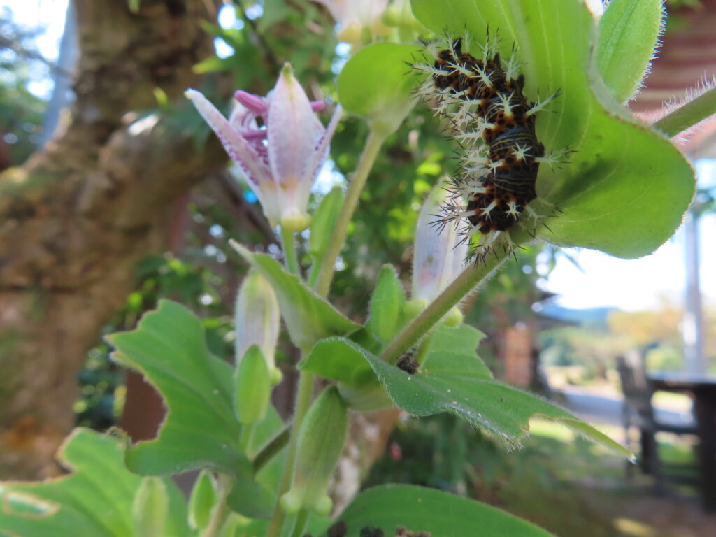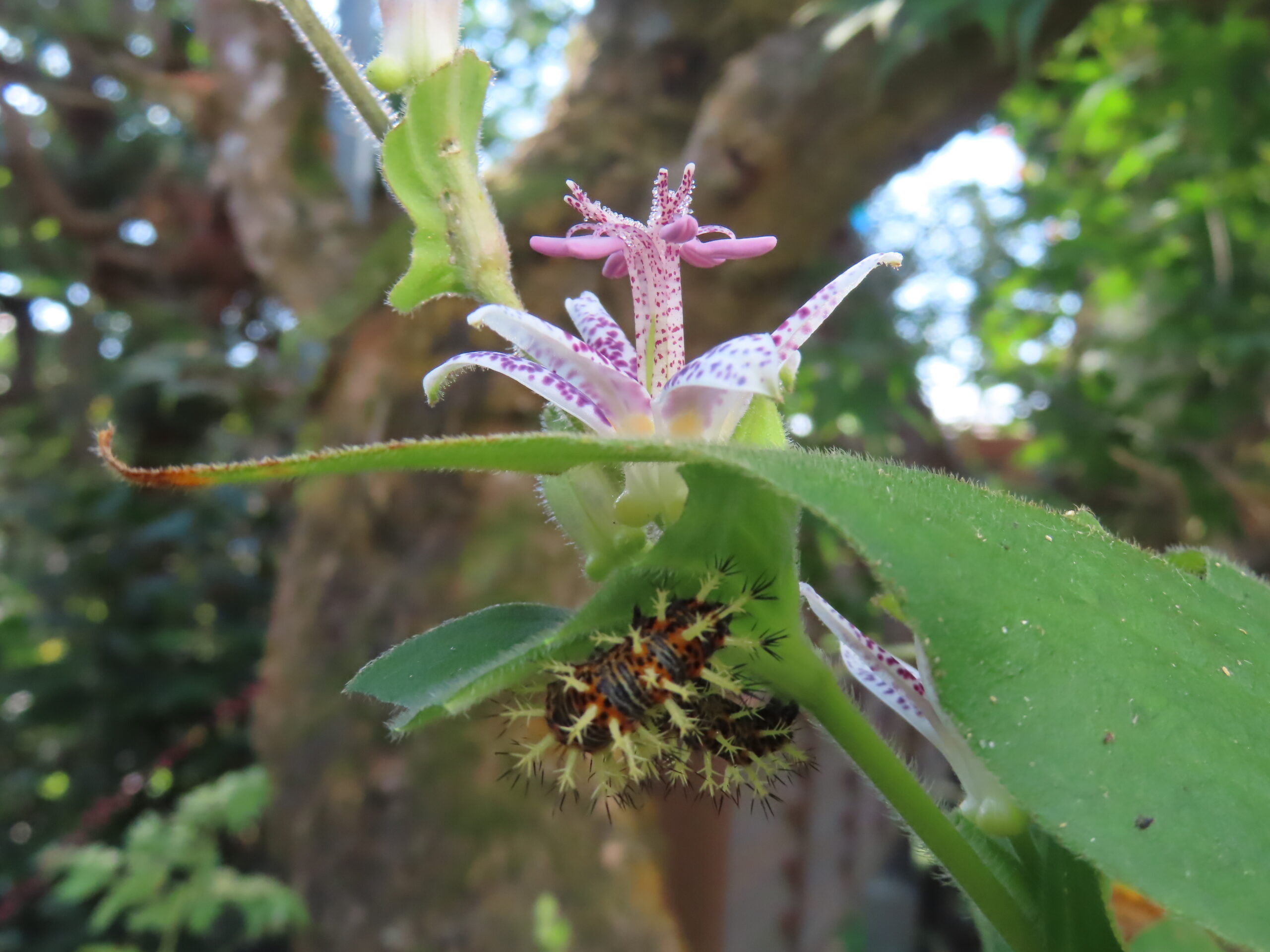 群生したホトトギスの中に同じ毛虫が5匹いました